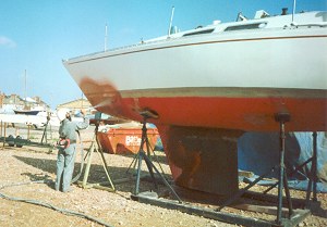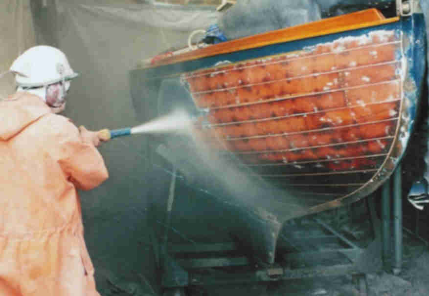 The low pressure sand jet can be used on all hulls :- metal, wood, marine ply, ferro-concrete and fibreglass.